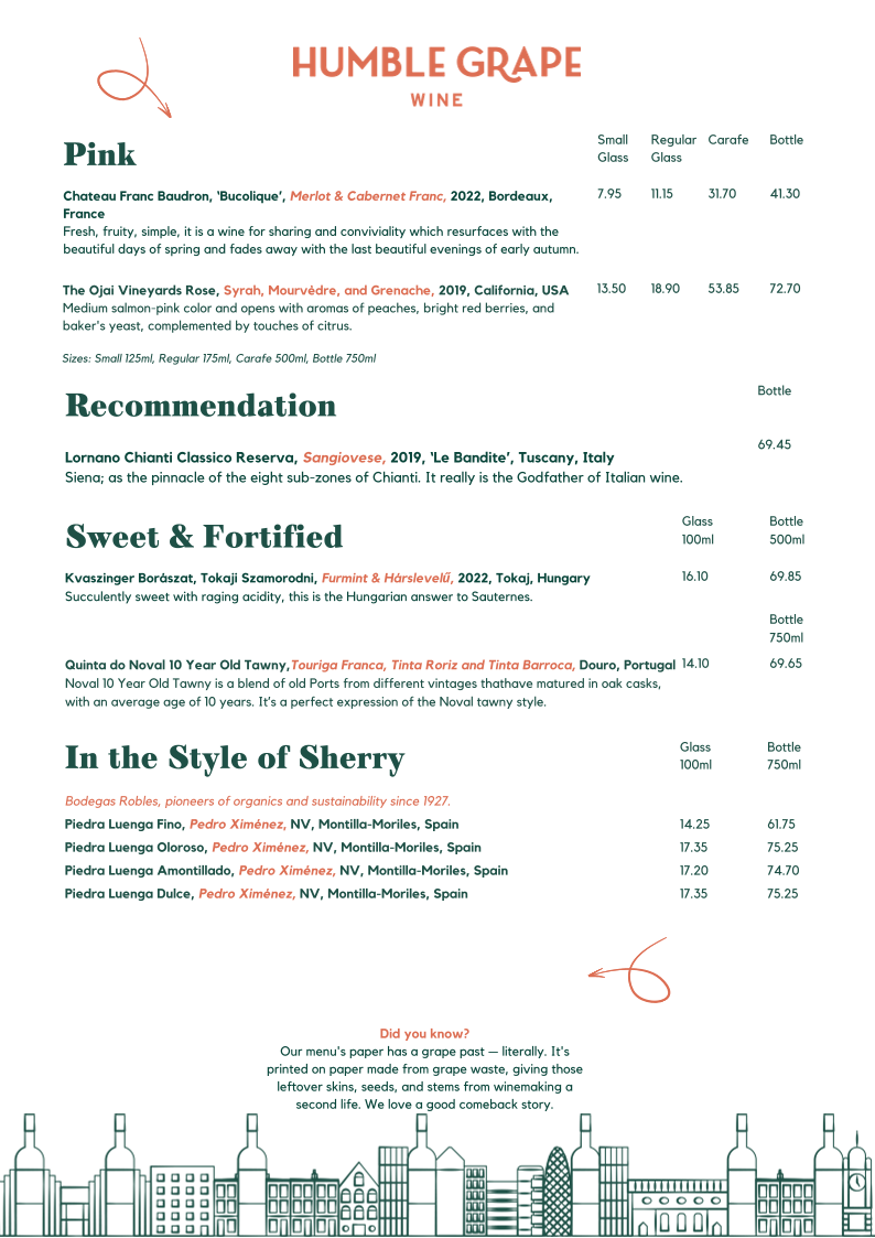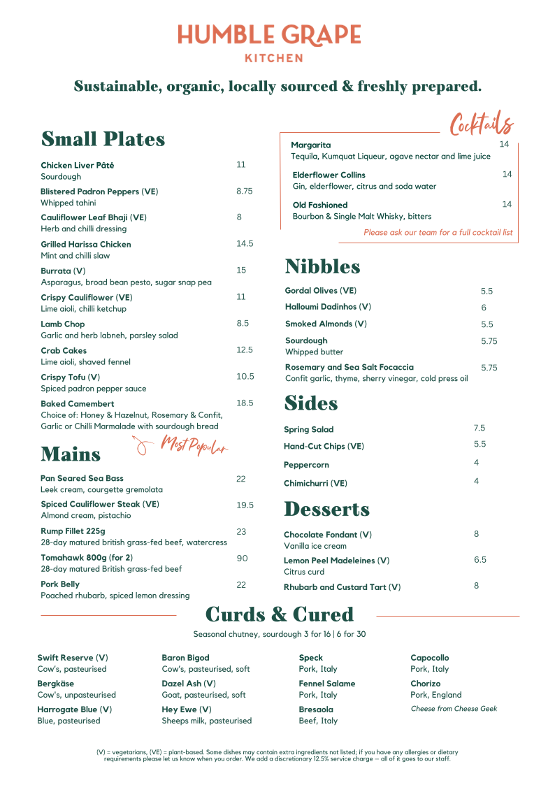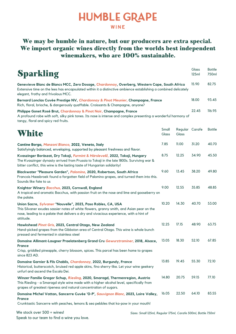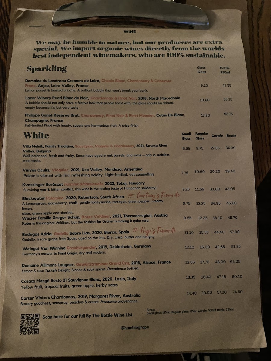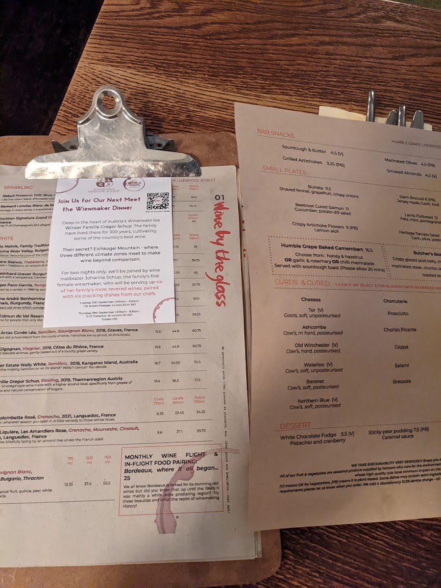 Humble Grape Liverpool Street offers an inviting menu that beautifully complements its extensive wine selection. Nestled in the heart of London, this cozy wine bar features delectable dishes designed to elevate your dining experience. Start with a fresh Spring Salad (£7.50) or delight in hand-cut chips (£5.50), both perfect for sharing. Among the highlights, the rich and creamy Camembert emerges as a customer favorite, often paired with a carefully curated wine recommendation.